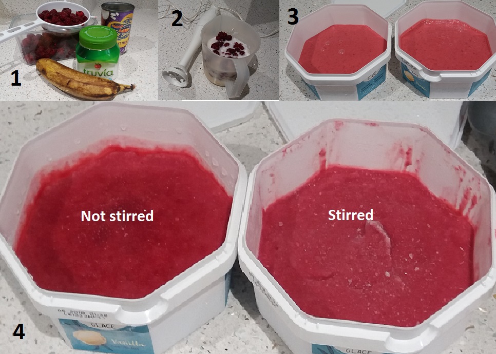 Last week my lovely friend Jackie, who has a huge veggie plot, brought me some of her lovely raspberries. There were far too many for me to eat before they spoiled though so I decided to experiment with some ice cream, even though I don’t have an ice cream maker. It’s such a long time since I’ve eaten ice cream, as someone who is aiming to both minimise dairy and avoid sugars! I thought I’d see if there would be a difference between putting some effort into stirring it regularly and just leaving it to freeze, to see whether it could be a truly low energy recipe. Mind you, giving it a good stir every hour wasn’t too energy draining either!